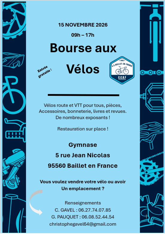 Le Club Cycliste de Baillet-en-France (aussi appelé CCBF ou CC.Baillet) est un club amateur de cyclisme sur route a taille humaine. Nous vous proposons des sorties hebdomadaires, des compétitions ou encore de participer aux prochains grands défis sportifs de votre vie, le tout dans une ambiance conviviale et solidaire.