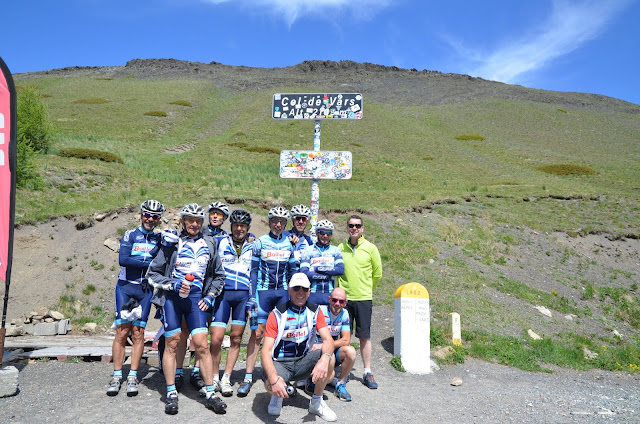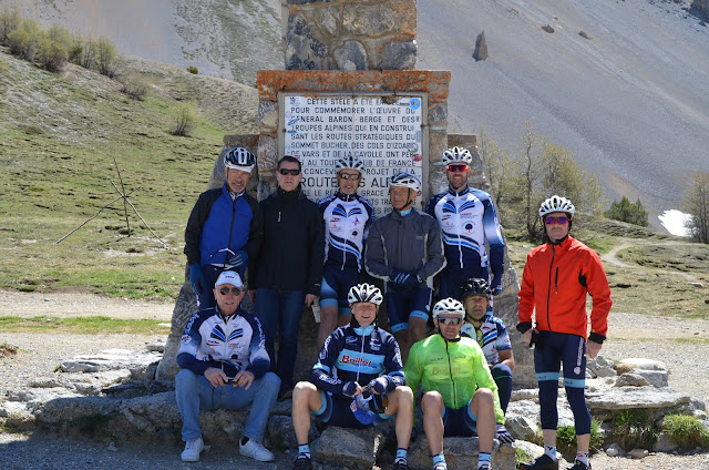 Après la descente jusqu’à Guillestre, la route s’élève de nouveau dans des pourcentages de 8 à 9% sur 8kms avant un replat et à nouveau de 6 et 7% sur les 8 derniers kilomètres. La chaleur pour la première fois faisait souffrir les organismes. Durant l’ascension Rémi mettait pied à terre, une douleur au genou l’empêchait de poursuivre l’ascension du col. Le groupe s’est à nouveau éparpiller, Bernard, Fred, Laurent, et Patrick. Patrick était dans une forme éblouissante. Tout le monde s’est regroupé au sommet et a entamé une descente vertigineuse de plus de 30 kms filmée par J.Jacques. Nous sommes arrivées à Barcelonnette vers 17h à l’hôtel du Cheval Blanc.