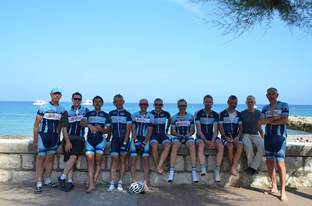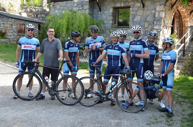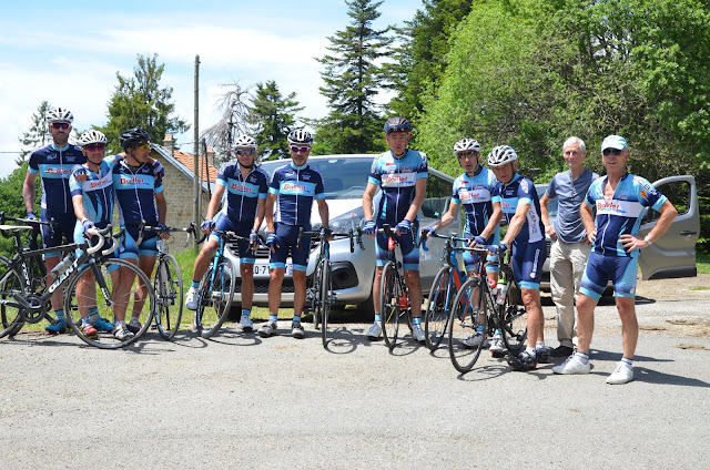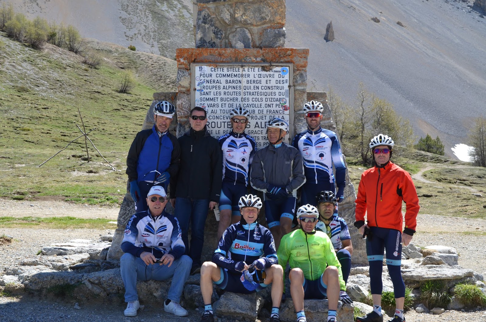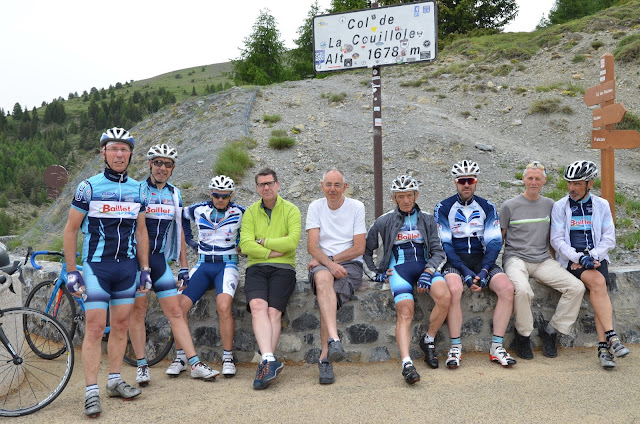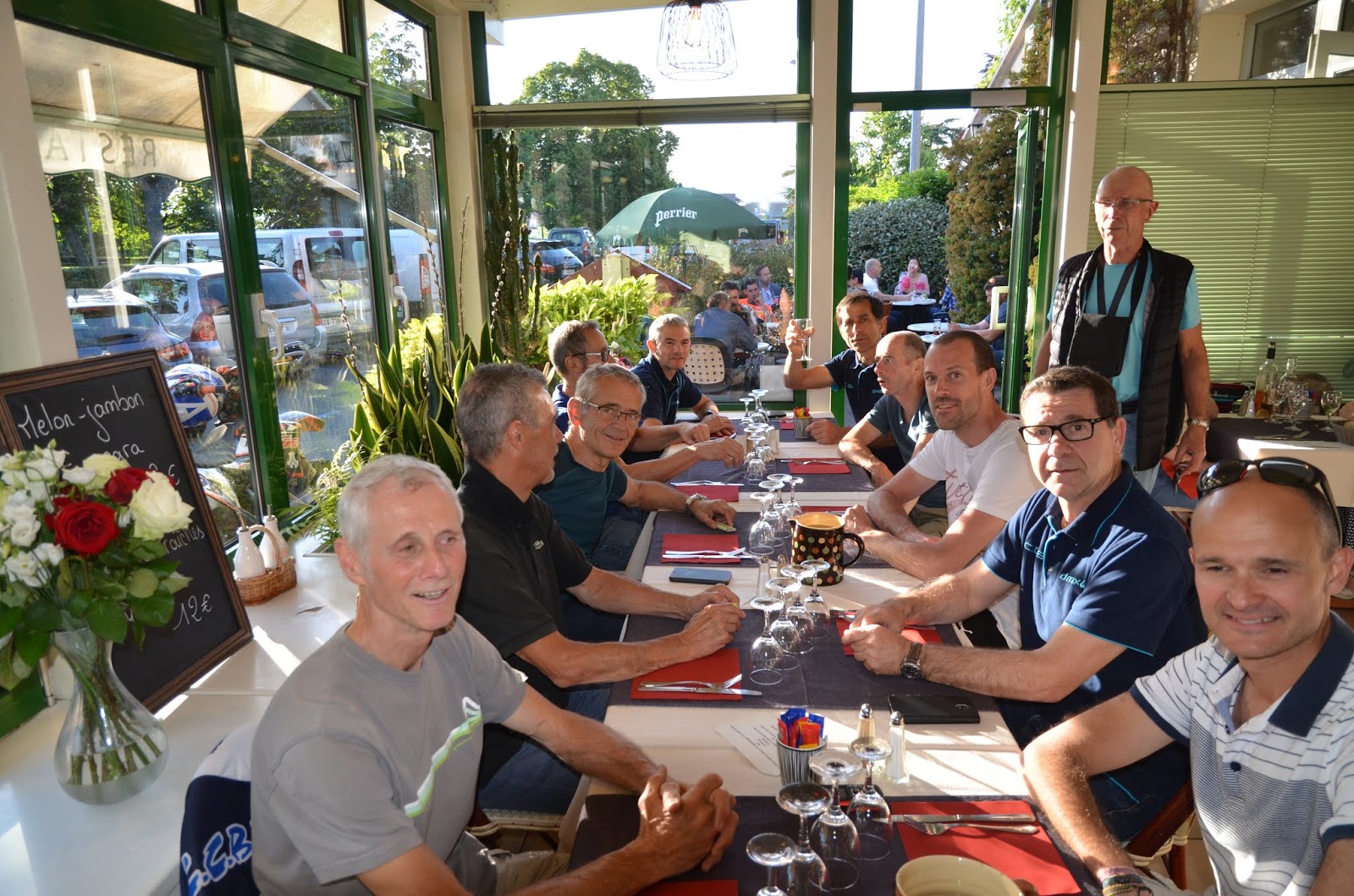 Avant dernière étape et surement la plus difficile avec 4 cols à franchir, et la fatigue accumulée au fur et à mesure des autres étapes. Les organismes sont bien éprouvés. Rémi ne remontera pas sur son vélo, une tendinite au genou, son frère Alain après sa chute à des douleurs dans le dos ce qui l’oblige à déclarer forfait. Le groupe amputé de deux éléments s’est élancé du centre de Barcelonnette vers le col de la Cayolle. Plus de 30 kms d’ascension, le départ plutôt roulant, mais au fil des kilomètres la route s’élevait avec des pourcentages entre 6 et 8% et un vent de face qui compliquait la progression du groupe. Après le passage du col, des virages impressionnants et une vue magnifique sur la vallée. Nous nous sommes arrêtés pour un pique-nique bien mérité. Après une longue descente, le col de Valberg 1662m d’altitude avec 8 kms à 8% avant le remonter sur le col St Anne. Plusieurs ravitaillements en eau et en bananes par le staff technique des frères Lecornu avec un accompagnement à l’harmonica et blagues salaces. Gérard a enfourché son vélo à la moitié du col de la Couillole. Il finit le parcours à 3 kms du sommet du col de St Martin où se situe l’auberge des Mures, après avoir fait une ascension de 11kms à 8% avec le reste du groupe