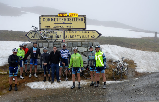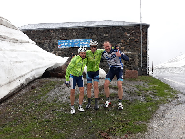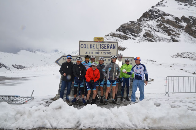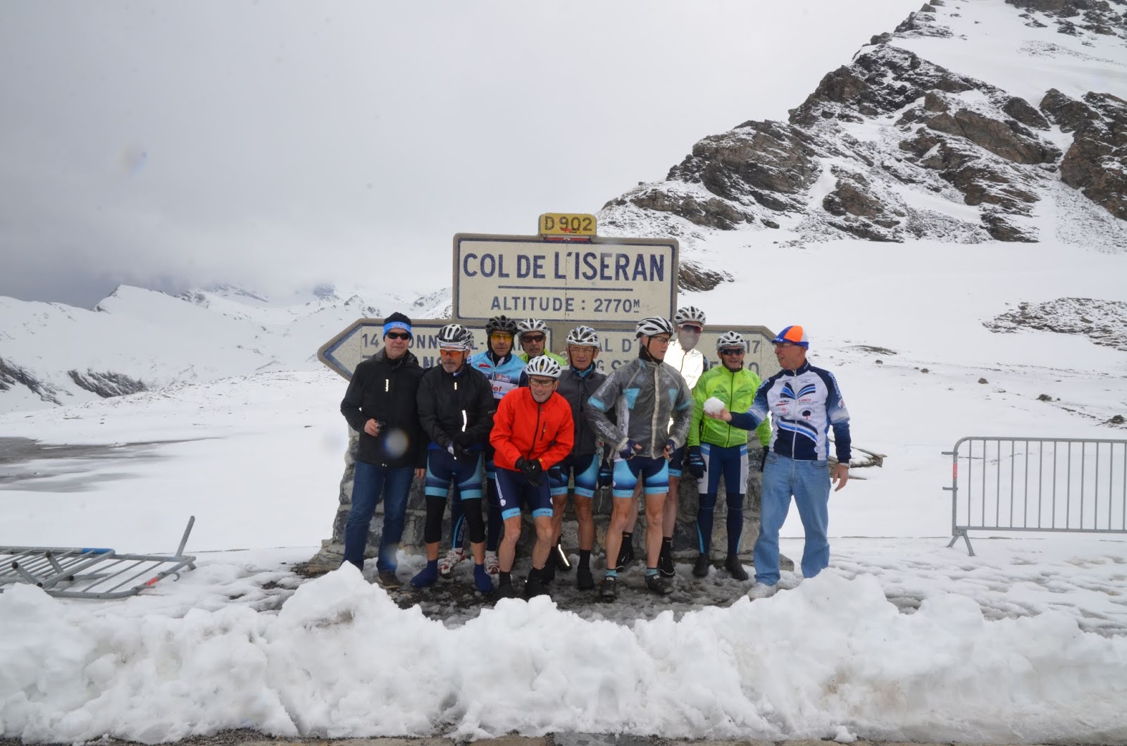 C’est par un temps sec que notre équipe a entamé son périple avec d’entrer de jeu l’ascension du col de l’Iseran en passant par Tigne et Val d’Isère. En sortant de l’Hôtel une montée pendant 6 kms a plus de 10% petite descente et 37 kms non-stop de montées avec une température qui baissaient au fur et à mesure de notre ascension. C’est avec détermination qu’ils ont abordé cette difficulté Gilles était partie 20 minutes avant le groupe, et il ne se fait reprendre que dans les derniers kilomètres par Bernard et Laurent. Nos cyclos ont fini les dernières rampes du col entouré de murs de congère parfois de plusieurs mètres. Malgré le vent, et la pluie qui commençait à tomber, nous avons pris le temps de faire une photo, avant d’entamer la descente jusqu’à Bonneval sur Arc. Un casse-croute bien mérité avant de continuer la route, avec malheureusement la pluie qui c’est invité de nouveau. Didier s’est joint au groupe à ce moment-là.