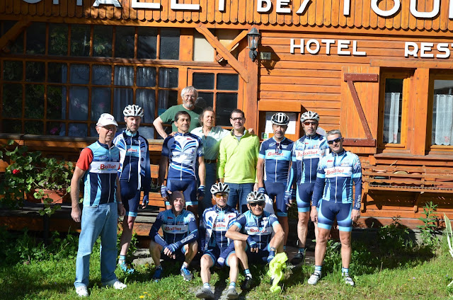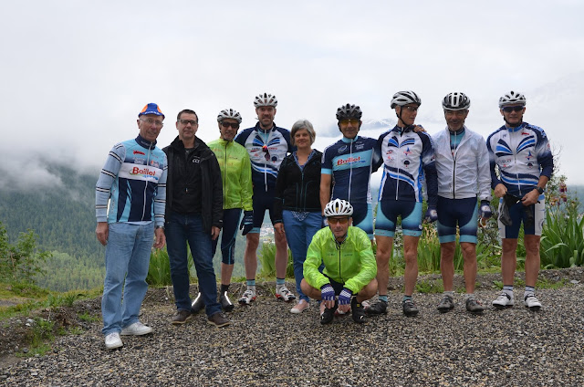 Après une bonne nuit réparatrice à l’hôtel Beau Site, Fabrice Pennasse est reparti vers ses obligations familiales, heureux d’avoir partagé la première étape avec nous. Le groupe s’est élancé dans le col des Aravis sous un ciel menaçant. Pendant ce temps Gérard et moi allions faire le ravitaillement à la Clusaz. Le groupe est monté sans rencontrer de pluie dans un rythme assez soutenu et après une belle descente a entamé le col plutôt roulant des Saisies 1655m. C’est sous une pluie battante qu’ils ont fini l’ascension du col et entamé une descente avec une route détrempée. À la sortie de Beaufort, nos neuf valeureux cyclistes ont pu reprendre des forces avec un pique-nique bien mérité. Ils se sont élancés à l’assaut du col de Mairaillet 1605m sur des pentes à 8 et 10% arrivée au sommet le groupe a essuyé un orage qui les a contraints à se réfugier sous un abri de fortune. Après l’orage, Gérard a enfourché pour la première fois son vélo pour l’ascension du Cormet de Roselend 1968m sous un soleil timide avec des vues magnifiques sur le lac. Arrivée à Bourg St Maurice, l’équipe à attaqué le col du St Bernard sur 6kms pour rejoindre le Gîte les Balcons du Molliebon il était 16H30 et Fred, Laurent et Bernard ont décidé de faire la montée du petit St Bernard, il restait 25 kms d’ascension sur des pentes à 5 et 7%. C’est sous un déluge de pluie de vent de grêle et de froid 2 à 3 degrés qu’ils sont arrivés au sommet, après une crevaison au dernier kilomètre. C’est grelotants de froid qu’ils se sont engouffrés dans le véhicule après avoir passé plus de 8 heures sur le vélo 130 kms et 5 cols et 4200m de dénivelé. Un grand bravo a eux. C’est dans un gîte chaleureux que l’ensemble du groupe a repris des forces pour une nouvelle étape.