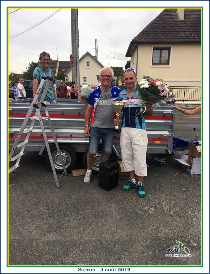 Dimanche 4 août, sous une belle chaleur, une soixantaine de coureur au départ de Sarron. Trois représentants du CCBF Gilles, Marco et Richard.  Course animée, avec beaucoup de tentatives d’échappées de la part du CCBF. A 4 tours de la fin, je sors avec un gars de pont saint Maxence. On s entend bien mais le peloton reste à vue entre 100 et 200m.  A 1500m de l’arrivée, un coureur revient de l’arrière. C’est Marco. De suite je lui demande d’attaquer. Le gars de pont est cuit, il ne bouge pas. Je contre et reviens rapidement sur Marco qui m’attend. Il me laisse la victoire et fini 3. Encore une belle course d’équipe….au suivant….merci Marco